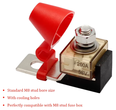 Installing the kit is quick and straightforward. The single 5/16″ (M8) stud and 3/8″ (M10) terminal mounting hole ensure compatibility with most setups. The package includes everything you need: a fuse box, a red insulating cap, a washer, a lock washer, and a hex nut.